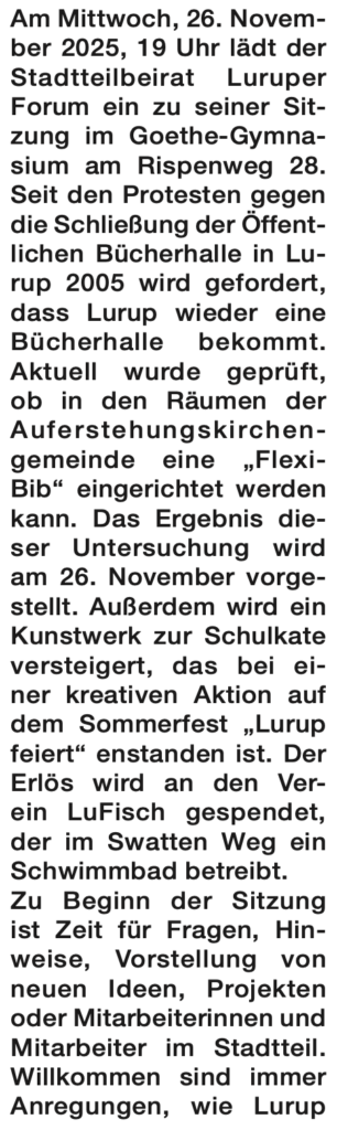 Start Presse Versteigerung zugunsten von LuFisch Versteigerung zugunsten von LuFischKatja Prahl19. November 2025Presse 19. November 2025 Luruper Nachrichten